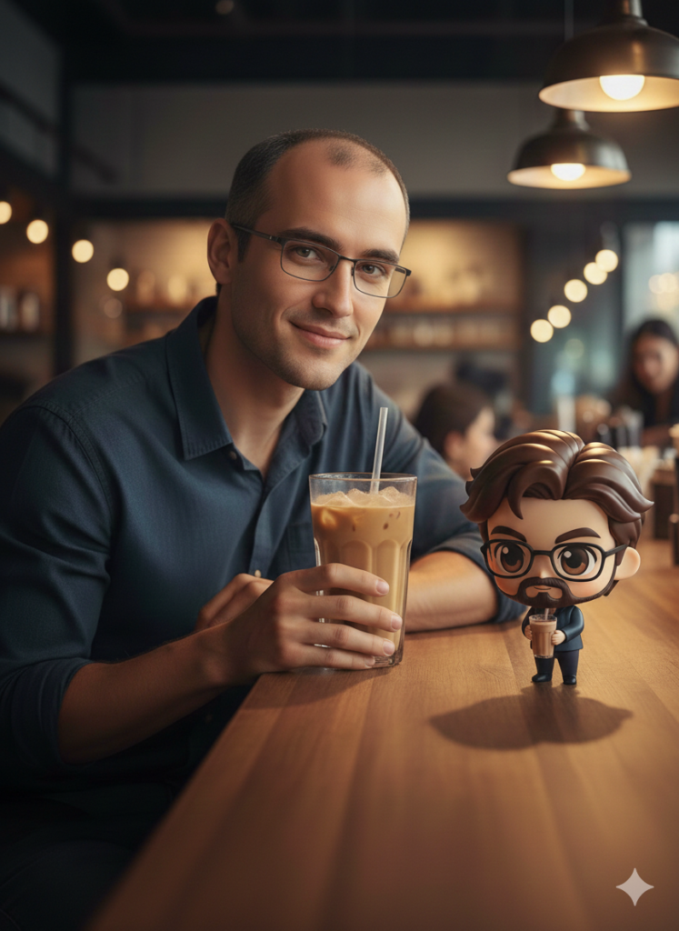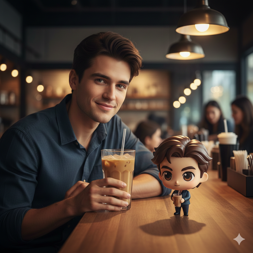 Bu yazımda, Gemini kullanarak yüklediğim bir fotoğraftaki yüzü birebir koruyup tamamen yeni ve sinematik bir sahne oluşturmayı nasıl başardığımı paylaşıyorum. Amacım; karakter kimliğini bozmadan modern bir kafe ortamında profesyonel görünümlü bir kompozisyon üretmek ve aynı kareye 3D chibi versiyonunu eklemekti.